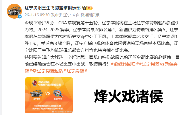 辽宁男篮官方公告中写说念:“终点要呈报无边球迷一个好音书:因肌肉拉伤缺席此前辽篮一起比赛的赵继伟,现在照旧细目会在本场比赛中出战,敬请期待!”